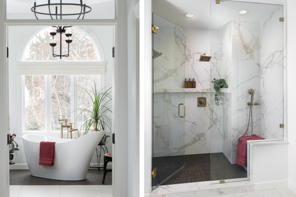 Rather than using just one floor tile in this bathroom, we chose two. The dark porcelain mosaic that looks like wood parquet highlights the tub area as a separate space. The shower walls may look like marble, but they are actually clad in a carbon-neutral, ultra-compact porcelain surface by Cosentino. The look of marble without the upkeep. /Photos by Karen Palmer.