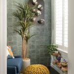 The plants are part of the family. Their height meets the window walls, turning a beautiful room into a living garden. Layered rugs soften the acoustics and upholstery absorbs the rest, which is why voices land comfortably and guests tend to linger. Just beyond the main seating, a small sage bar turns hospitality into a daily ritual. A hammered sink catches the light and a bold painting of a boy with a rooster gives the niche a knowing smile. A tray of glassware and a small vase of yellow roses complete the welcome. In photos it reads as a lovely vignette. In real life it quietly says, you are taken care of here.