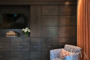 This custom dresser encompasses the entire wall, with storage sized for every need. It also encapsulates the TV to minimize a usual eyesore./Photo by Karen Palmer