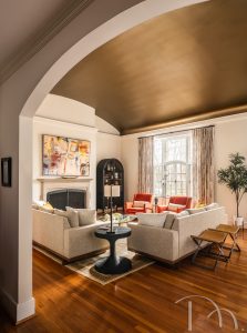 What had been painted a boring white, the barrel ceiling in a warm copper tone is the crowning jewel of this inviting living room./Photo by Karen Palmer