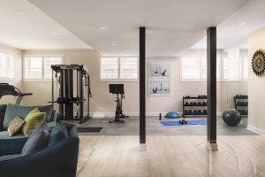 A different vinyl floor was used to delineate the workout space from the gathering space in this lower-level remodel./Photo by Karen Palmer