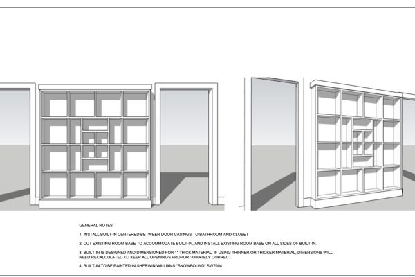 we created this bookcase design for a client who wanted to house books and treasured finds. Small spaces for tiny treasures sit in the middle of the design./Floor plan by Marcia Moore Design.